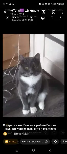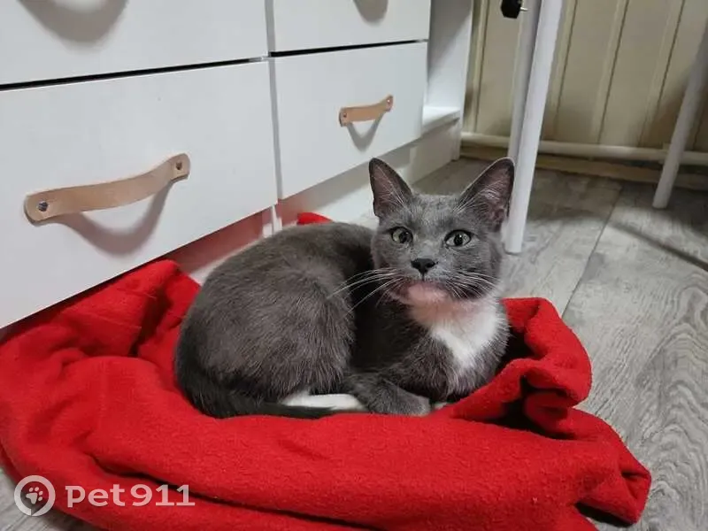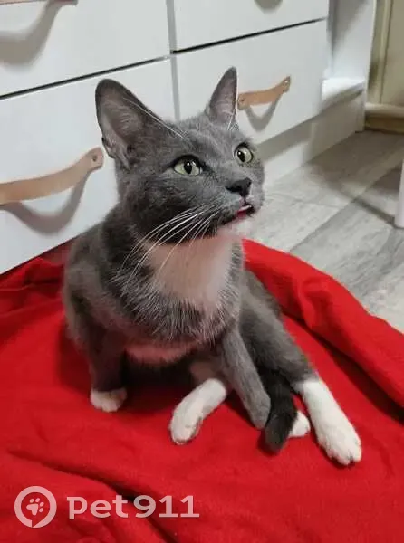 Найдена кошка, серый окрас с белыми пятнами на подбородке, шее, животе, лапках. Глаза песочного цвета. Возраст не понятен, но кажется молодой. Очень добрая, контактная, спокойно дается в руки, видно, что домашняя. Гуляли с детьми, она к нам подбежала и пошла за нами. Временно приютили, ищем хозяев или в добрые руки. На счёт лотка не уверены, так как у нас дом, она выходит в туалет на улицу.