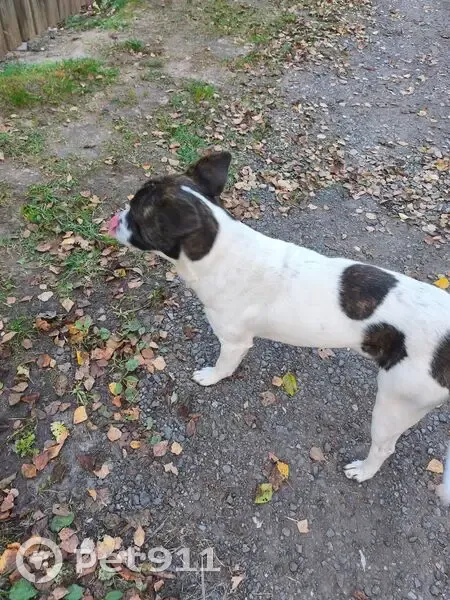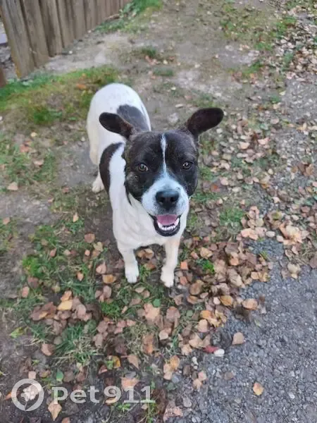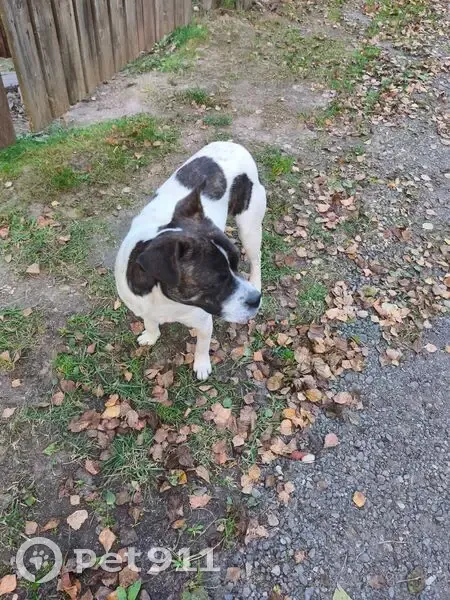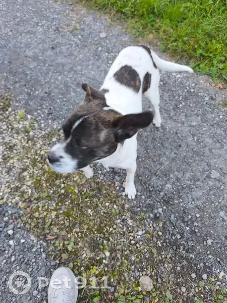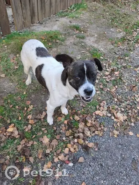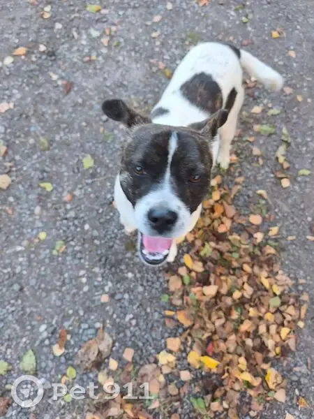 Кобель, молодой, окрас белый с тигровым, похож на питбуля, ласковый, умный, был с ошейником, потом потерял. Бегает по всем дачам, пытается найти хозяев.