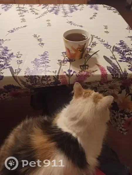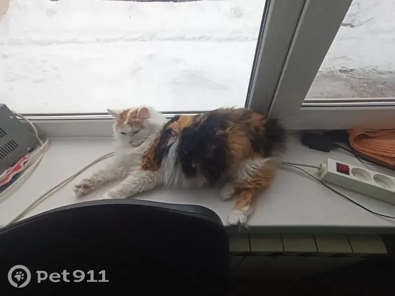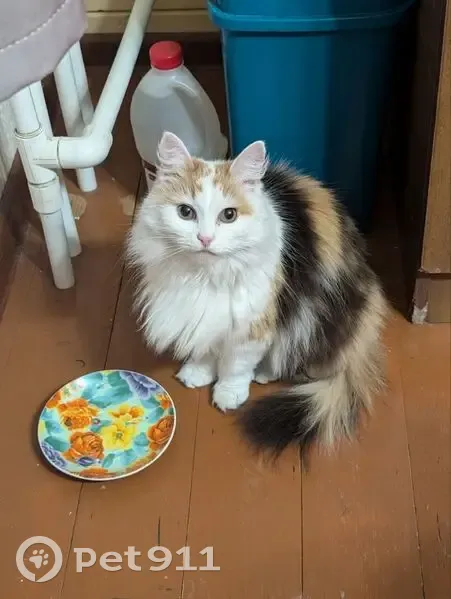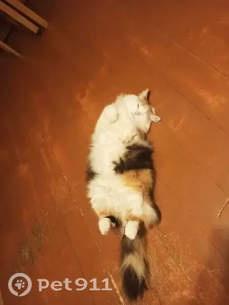 Небольшая трёхцветная кошка. Вес около 3-4 килограмм, размером не больше 40-50см. Зелёные глаза, характерные завихрения на ушах, на голове два больших коричневых пятнышка. Очень пушистая, немного облезлый хвост. Стерилизованная и привитая.