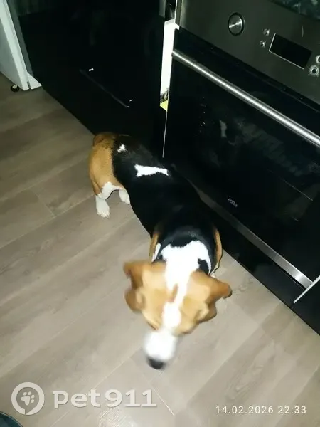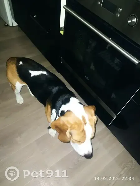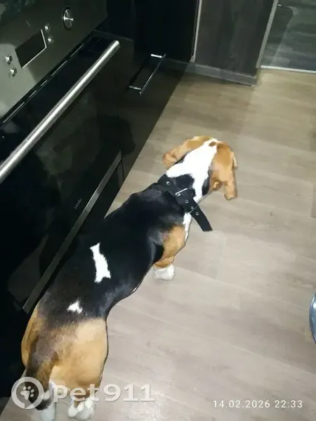 Бигль триколор, с белым пятнышком на спине и рыжим пятнышком на голове. Собака нашлась в районе улиц Октябрьская-Бульвар Комсомольский. Была в черном ошейнике, на ошейнике не было кольца для поводка. Кобель