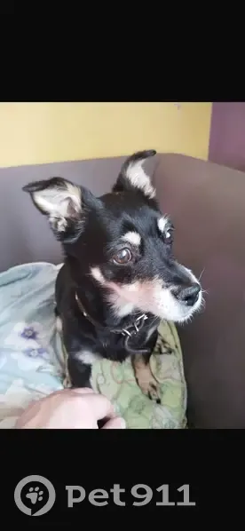 Окрас черный с рыжими лапками, небольшая, хвост короткий, ошейника нет, сорвалась с него