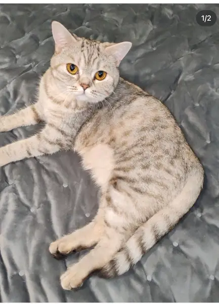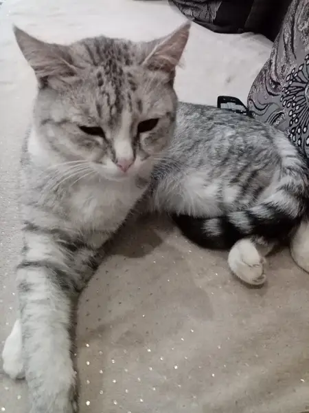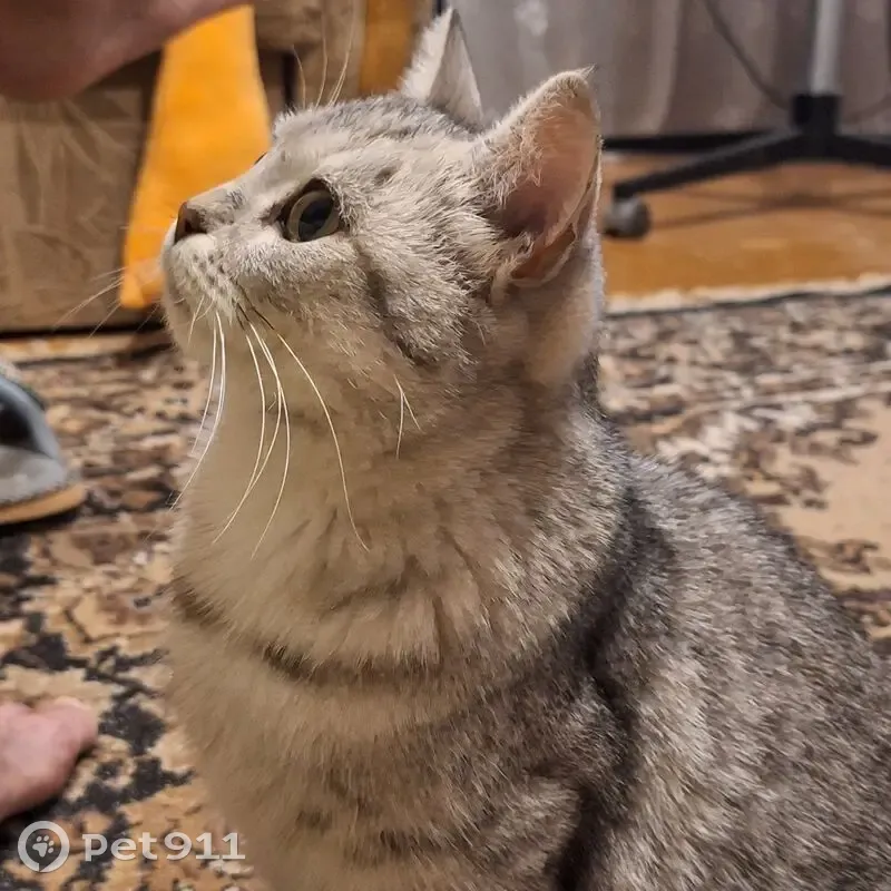 Окрас тигровый:серо-белый, кошка не пугливая, ласковая, ухоженная, гладкошерстная. Нашли на улице рядом с домами, решили временно забрать до объявления хозяина, т. К много собак здесь ходит.