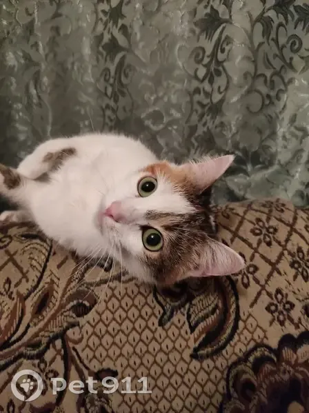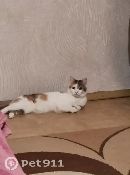 Кошка,девочка. Окрас - трехцвнтная (много белого с рыжими и серо-коричневыми пятнышками) . Выскочила через окно(1этаж)