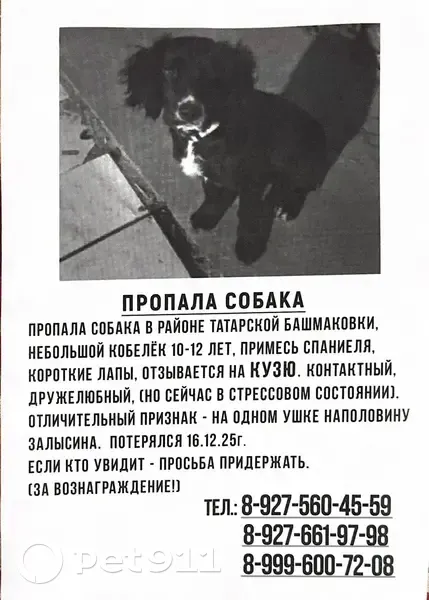 Черный с белым пятном на груди. Небольшой пёс,возраст 12 лет. Кличка Кузя. Был пойман в автогородке при отлове собак. Сбежал в Татарской Башмаковке во время доставки в собачий питомник Русакова.