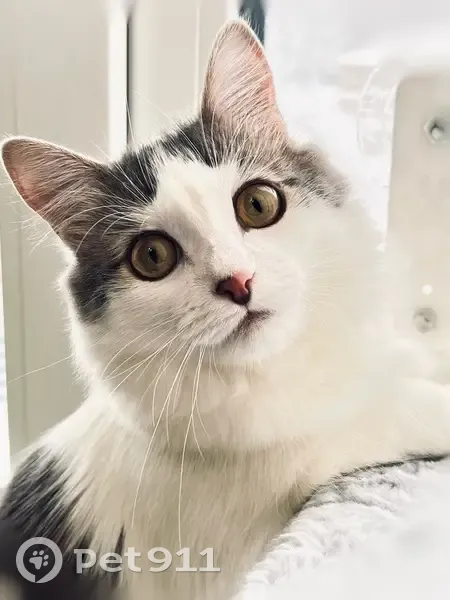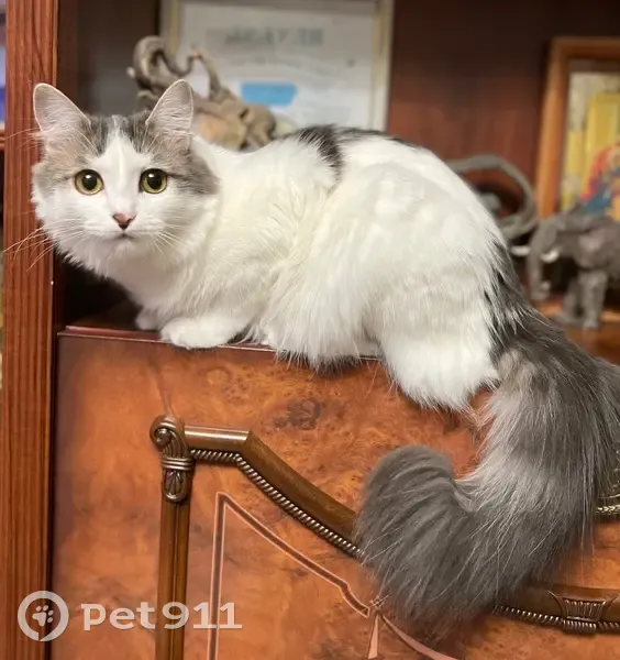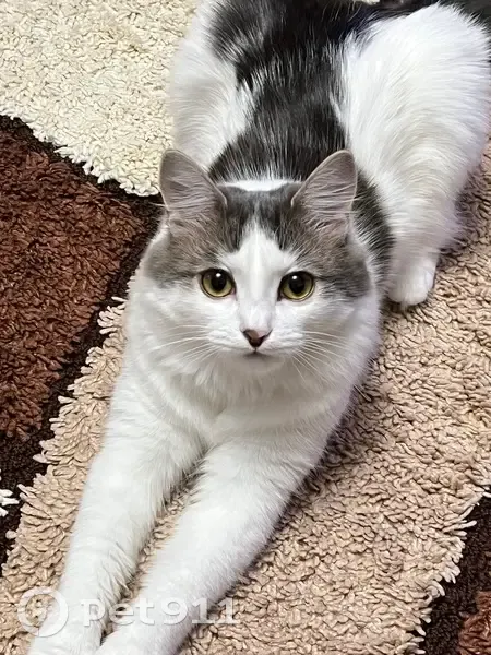 Бело-серая, ушки серые и над глазками наискось, как серая шапочка, на спине два пятна серых как крылья, и далее серая полоса переходит на хвост, немного пушистая. На самом носу пятнышко, как будто носик грязный. Я уезжала, кошка осталась у родственников, у них она выпрыгнула с балкона, испугалась и убежала.
