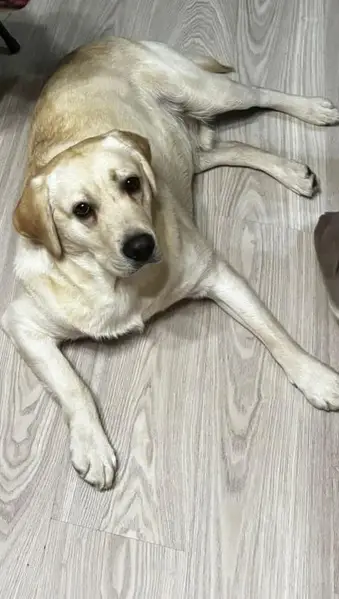 Метис, мальчик, 2-года, полностью кремового цвета с чёрным мехом на кончиках ушей, среднего размера, не агрессивен, собака убежала с участка во время течки другой собаки