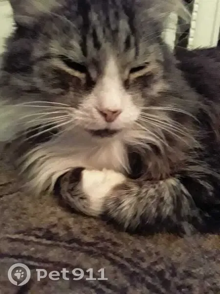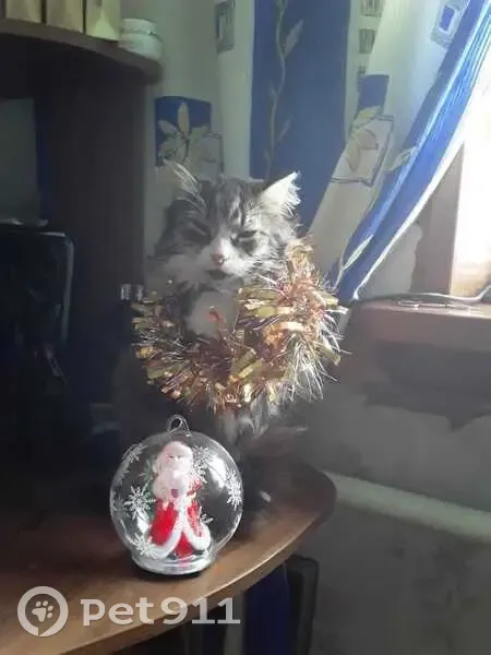 Серенький с белой грудкой и белыми тапочками на лапках. Возраст почти 10лет (в июле исполнится), вес около 4 кг, пушистик. Осторожный, в руки не даётся, только выборочно.
