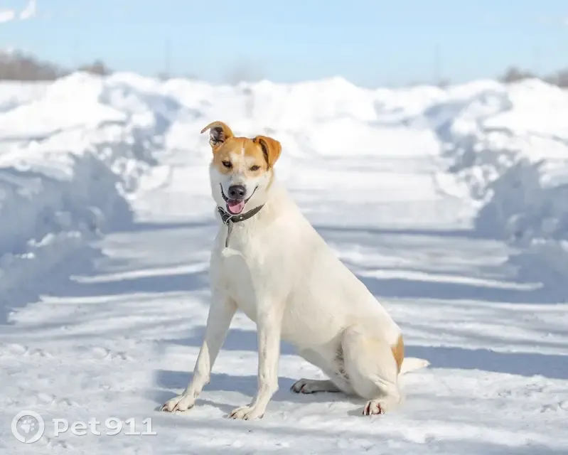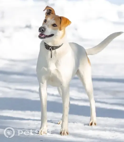 Белая с рыжими ушками , справа за передней лапой рыже-черный окрас , у хвоста слева рыжий. Испугалась взрывов петард и перепрыгнула через забор . Ласковая и добрая, если позовут может подойти, не агрессивная . Собака чипирована .