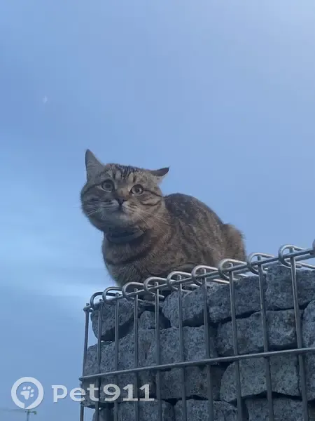 Серый с полосками кот/кошка. Есть ошейник. Возможно, от блох. Людей побаивается. Покормила его, ел с аппетитом. Чистый кот. Появляется там вечером, прохожий сказал, что видел его там уже неделю назад. Сходила 5 июня днём. Не нашла. Возможно, спит под кустами.