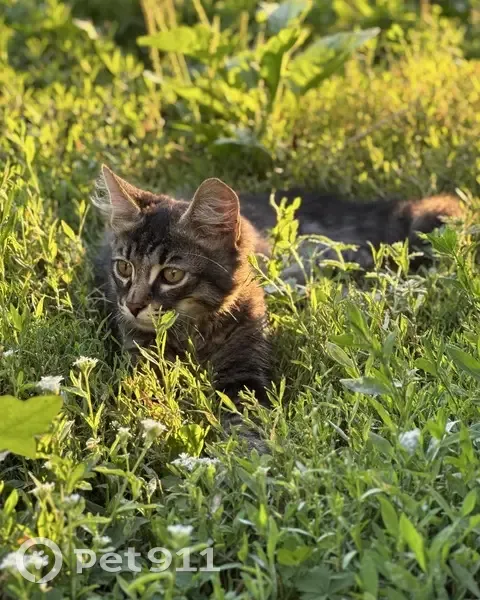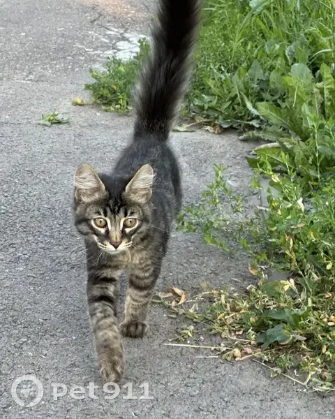 Котенок 3-4 месяцев, выскочил из кустов в сквере «Студенческий». Живот слегка кудрявится, усы похоже пострижены ножницами (ровные срезы). На еду не набросился, чистый, ласковый, активный. Ровно по центру носа коричневая полоска