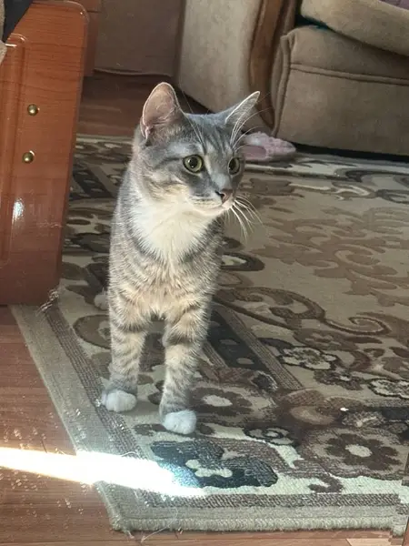 Мальчик. Серого цвета. Не кастрирован. Бегает со стороны магазинов «Магнит», «Улыбка радуги» на ул. Кулахметова, д.17к2. Чисты, ухоженный, ласковый, спокойно подходит к людям.