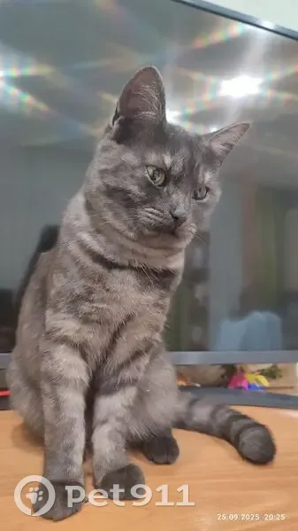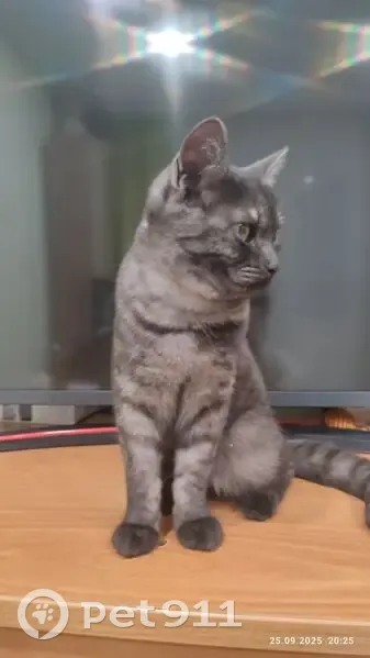 Тёмно-серый пятнистый окрас, гладкая шерсть. Возраст примерно полгода возможно больше. Кошечка. На руки идет с доверием, ласковая, игривая, знает лоток. Часто мяучит, хочет домой. Чистая. Взяла на передержку. Повесила объявление в лифте, но пока безрезультатно, взять себе не могу, своих трое хвостиков.