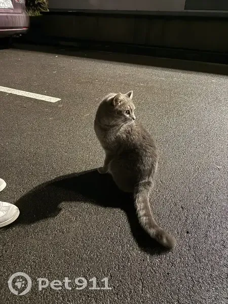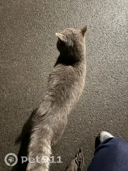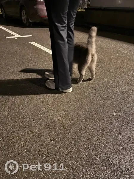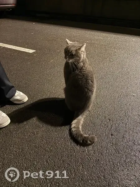 Серый, ласковый, спокойный, присутствует пятнышко на ушке от зажившей болячки, достаточно крупный, будто только потерялся, видно, что домашний. Ходил по парковке перед домом