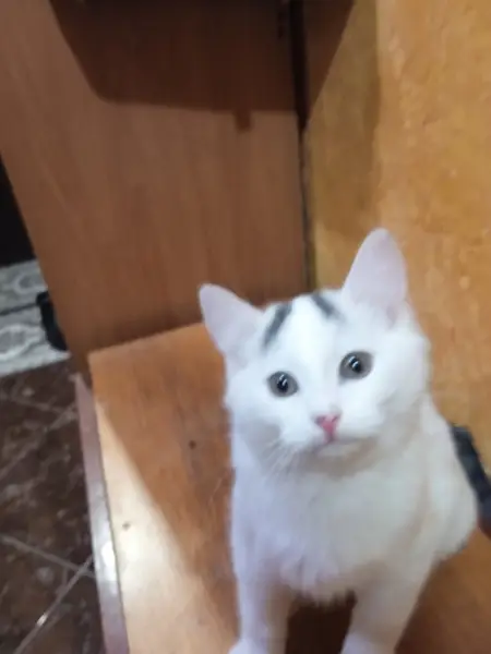 Котик домашний белый с черным хвостиком и родинкой на носу, очень ласковый. Не кастрирован. Придержали. Раскидали объявления по чатам Константиновки и Светлой долины.
