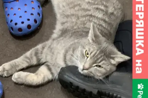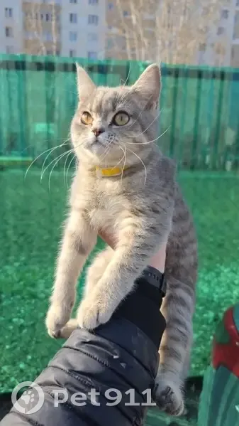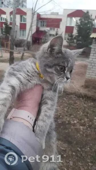 Серая кошечка девочка, на вид 3-4 месяца в жёлтом ошейнике, очень ласковая, ходит на лоток, временно взяли на передержку, но долго не сможем держать, есть свой питомец, хозяин отзовись!