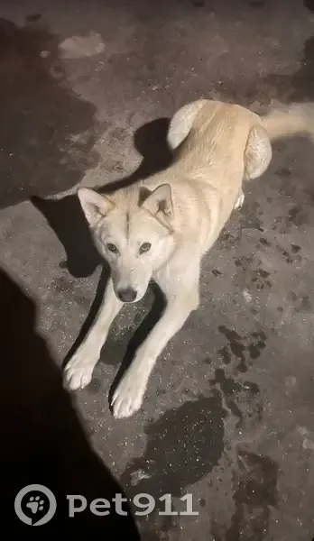 Кобель, белого цвета, с ошейником, добрый, команды знает, спокойный, ходит ищет хозяев.