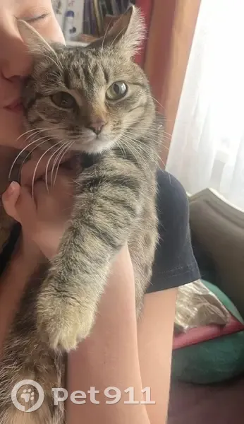 Николь 10 месяцев, она небольшого размера, беспородная , коричневая с черными полосками, с белым галстучком . Очень ласковая, но пугливая. На улице никогда не была до этого. Выпала со второго этажа , продавила москитную сетку
