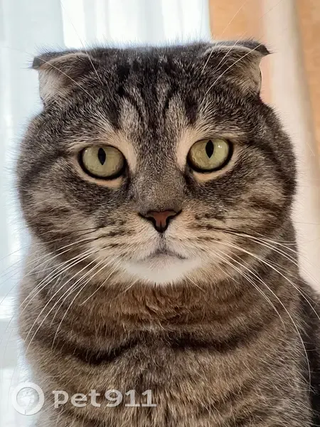 Вислоухий кот,окрас Табби в полосочку. Очень боязливый,так как не выходит на улицу обычно. У рта с левой стороны есть небольшая шишечка,под нижним клыком. Нёбо пятнистое черное
