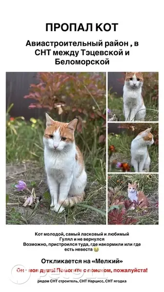 Авиастроительный район от СНТ-строитель1 / СНТ Ягодка пропал наш КОТ! Зовут «Мелкий», также может откликаться на «Рыжа, Рыжий» для связи : 904 662 45 50 Окрас : рыже - белый телосложение : стройное, щек выраженных нет, не полный, небольшая голова , острые черты морды, нет толстых щёк. Ушки немаленькие, стоячие, рыженькие. на лбу — белый окрас в форме огонька Сама морда внизу белая, макушка рыжая. ️На носу есть как родимое пятно- рыженькое посередине белого носа ️ ️на передней лапе есть рыжее пятнышко, на одной! Сами лапы белые ️ ️НЕ КАСТРАТ ️ ️ глаза : медово-желтые с рыжим отливом ПОТЕРЯН БОЛЬШЕ МЕСЯЦА! Если вы или Ваши знакомые вдруг подобрали такого кота — сообщите нам, мы хотим забрать нашего кота! Также если вы найдете - ПРИДЕРЖИТЕ ПОЖАЛУЙСТА! Кот не агрессивный. Можно придержать в подъездах или у себя дома ️ Если у вас есть возможность - скиньте в ДОМОВЫЕ ЧАТЫ!