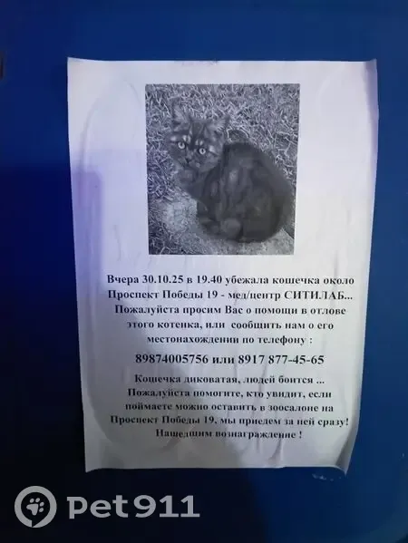 30.10 в 19:40 сбежала кошечка около медцентра Ситилаб по адресу — пр-т Победы 19. Если вы увидите котёнка, просьба сообщить по номеру: 89874005756 или 89178774565 Кошечка диковатая, людей боится. Котёнка можно оставить в зоосалоне по адресу - пр-т Победы 19 Нашедшим вознаграждение!