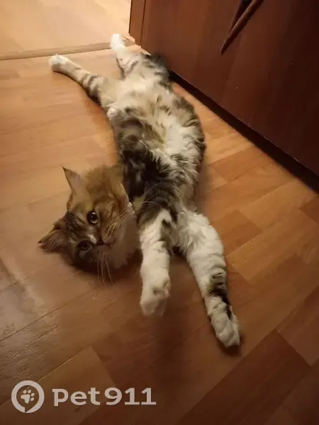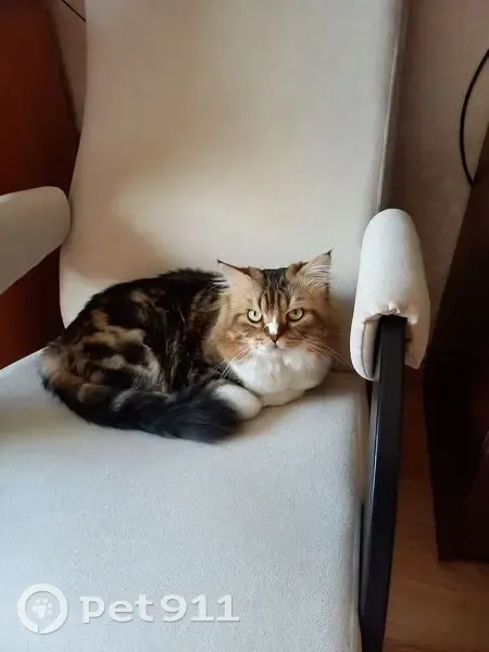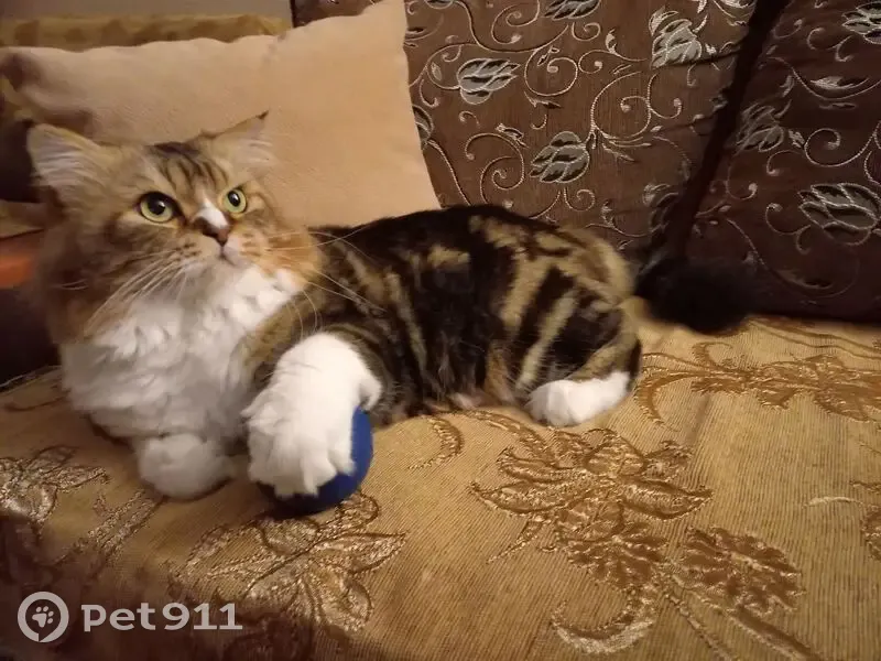 Домашний кот шотландский прямоухий.Окрас трехцветный: белый рыжий,чёрный.Шерсть мягкая,длинная.Глаза зелёные.Пугливый на резкие звуки,чужих.Вечером выгуливали всегда на руках,испугался звука машины,вырвался с рук,побежал за дом под стоящие машины и дальше пересадками,не откликался и нигде не было видно.