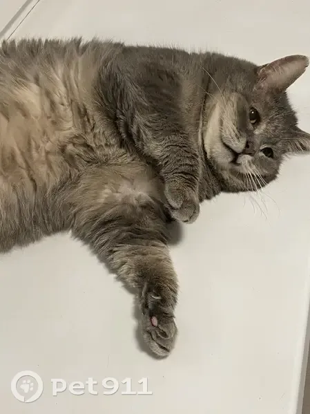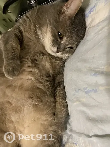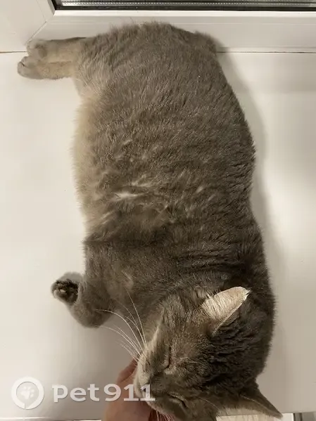 Серый очень толстый старый котик.
