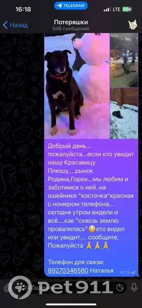 Добрый день... Пожалуйста... Если кто увидит нашу Красавицу Плюшу.... Рынок Родина,Горки... Мы любим и заботимся о ней.. На ошейнике "косточка"красная с номером телефона... Сегодня утром 5 фев. Видели и всё.... Как "сквозь землю провалилась"кто видел или увидит.... Сообщите, Пожалуйста за ней сразу приедут , Плюша ласковая контактная отличительный окрас Плюши белые носочки, грудка и белый носик 8 905 319 68 78 - Натая