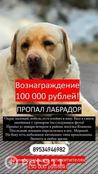 ️ Пропал лабрадор ️ Кличка - Оптимус. Вознагражднение 100 тыс руб. Тому, кто найдет! Окрас палевый, кобель, есть клеймо в паху. Был в синем ошейнике с трекером (на фото) Пропал 30 января вечером в районе посёлка Кояшлы. Последняя локация определялась в пос. Мирный. На боку есть небольшое пятнышко типа проплешины. Просим сообщить любую известную вам информацию! Оптимус - не просто питомец, он член большой семьи и его очень ждут дома! За информацию о похитителях - 150 тыс. Руб! Звонить в любое время: 89534946982
