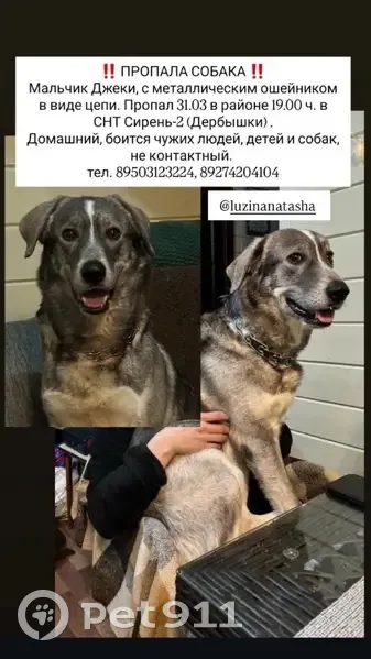 Пропала собака ! Мальчик Джеки , с металическим ошейником в виде цепи . Домашний , боится чужих людей , детей и собак , не контактный. Пропал в районе 19.00 в СНТ Сирень-2 . Тел. 89503123224 тел. 89274204104