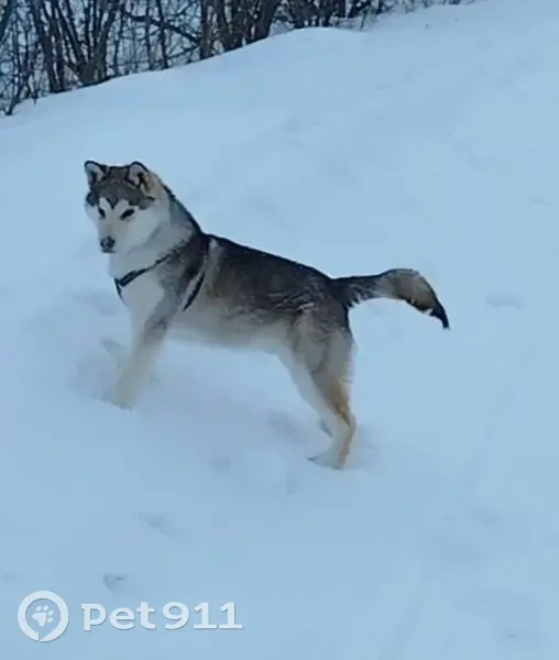 Собака серого цвета, порода маламут, добрая общительная собака, любит прыгать на людей выпрашивая ласку. Вероятно бегает с небольшим куском цепи на ошейнике (т. К сломалась цепь) Любит валяться в снегу