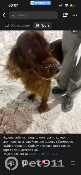Нашли собаку по адресу г. Кемерово пр.Шахтеров 49, была одна, есть ошейник. Сейчас собаку отвели в подъезд пр.Шахтеров 35. Номер для связи +7 (913) 120-15-63