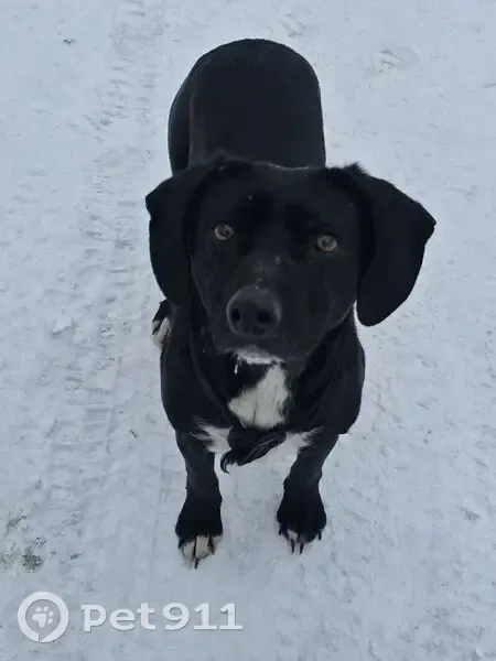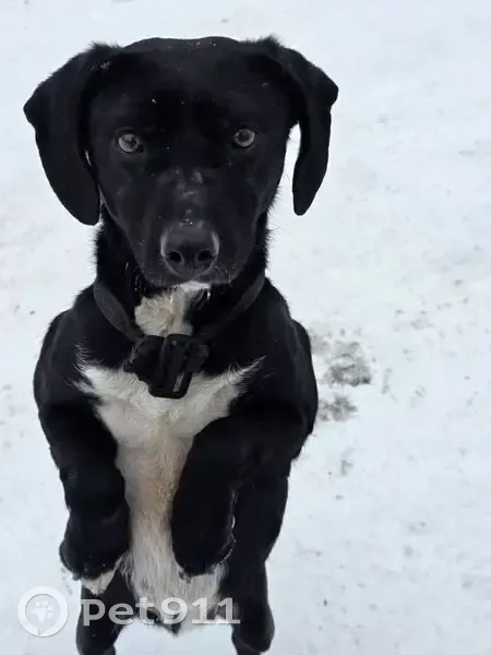 Чёрная с белой грудкой и маленькие следочки белые на ногах. Хвост не лохматый. Ушки висячии. Сидит и находится в течении дня в одном месте. Среднего размера. Вглядывается в прохожих. Бежит с радостью к детям и возвращается на место.Впечатление такое , что не знает куда идти. НА шее тряпичный ремешок. Голодная.