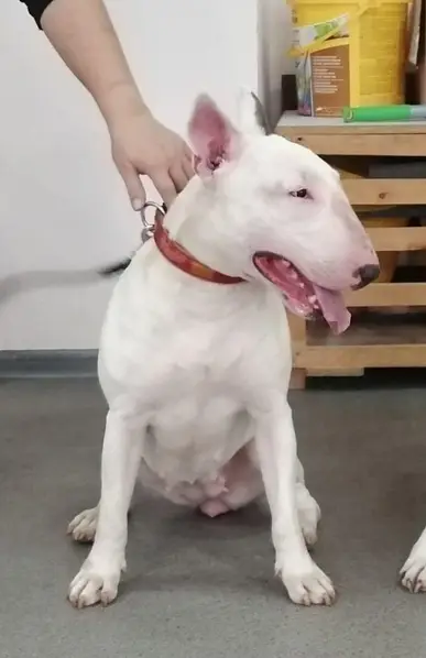 Вроде стаффордширский терьер. Щенок. Тёмно зелёный ошейник. Кабель, или сука - не знаю. Чёрно - белый окрас.И не думал писать объявление. Такие подробности не пришло на ум выяснить. Пока на ночь до утра оставил ночевать в тёплом помещении.