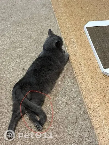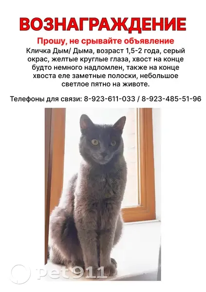 Возраст 1,5-2 года, серый окрас, желтые круглые глаза, хвост на конце будто немного надломлен, также на конце хвоста еле заметные полоски, небольшое светлое пятно на животе.