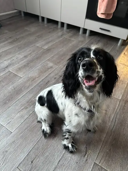 Возраст шесть лет, русский спаниель. Окрас черно белый