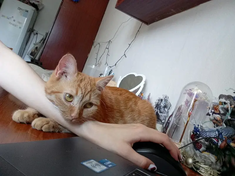 Рыженькая кошечка, девочка Фиолетовый ошейник от блох Что то с челюстью, немного припухший глазик Очень ласковая, видно что потеряна