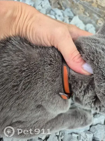 Темно-серая,вроде кошечка,очень ласковая,на ней ошейник чёрный с оранжевым.Потерялась видно давно,очень исхудала(Взяли на передержку пока,на улице холодно.