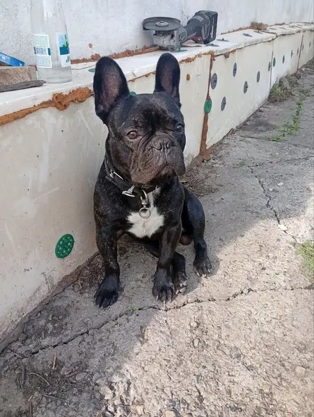 Найден пёс. Был испуган, сидел в кустах нашего двора. Сейчас находиться на передержки у моей подруги. Видно что домашний, на нём ошейник. Порода французский бульдог, мальчик.