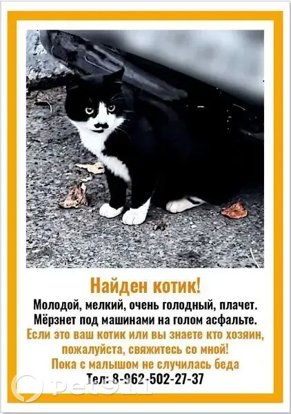 Найден котик! Молодой, разговорчивый, ласковый, пугливый. Мёрзнет под машинами на голом асфальте. Если это ваш котик или вы знаете кто хозяин, пожалуйста, свяжитесь со мной! Пока с малышом не случилась беда.