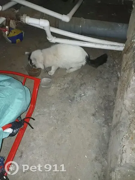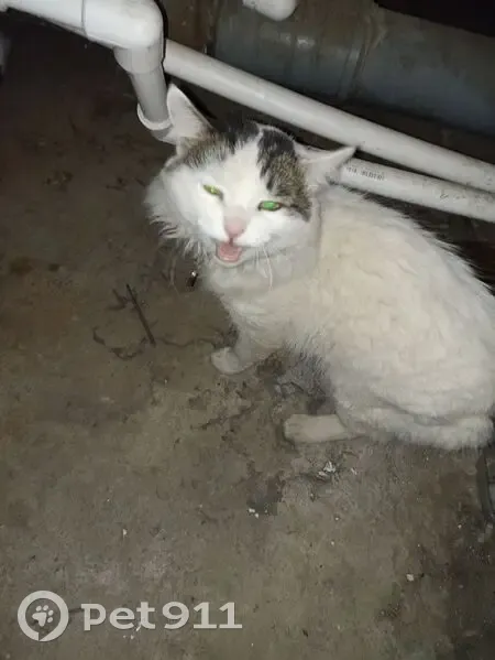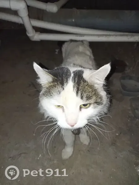 Пугливая кошка, мордочка с темным оттенком, сама белая, хвост темный, на шее ЭКО ошейник, с надписью КВ 32, прииски по району не увенчались успехом, на ошейнике петелька, похоже гуляла на поводке и сорвалась.