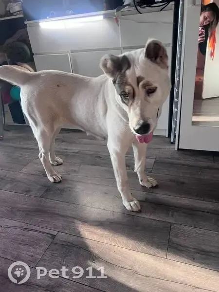 Найдена собака Алабай девочка, окрас белая, на голове коричнево серые пятна вокруг глаз, на одном больше, ушки коричнево серые, очень добродушная, подает лапу