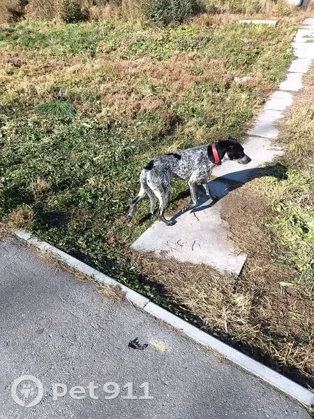 Пес крупный, серо-черного цвета, в пятнышки, в ярко красном ошейнике, бегает по Уссурийскому бульвару. Близко подойти не дает, начинает рычать, активный