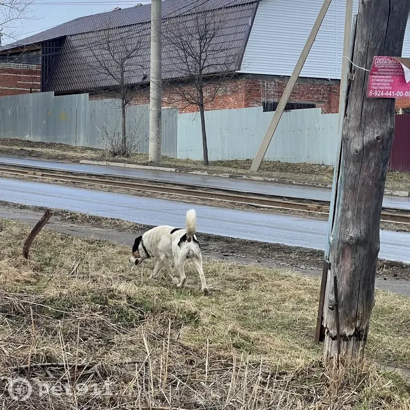 СОБАКА БЕГАЕТ ПО УЛИЦАМ КИРОВСКОГО РАЙОНА! 23.04 была замечена на ул. Джамбула — фото оттуда (точное место указано на карте), 24.04 бежала от ТЦ Счастье к Амурскому бульвару. Белая с черными пятнами, морда с черными и коричневыми пятнами. Выглядит потеряно, нюхает все время и озирается по сторонам. На шее черный ошейник. Пол не разглядела (девочка либо кастрированный мальчик). Фото только издалека, т. К. Пробежала мимо быстро.