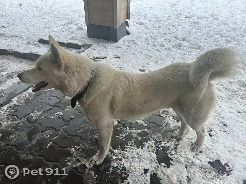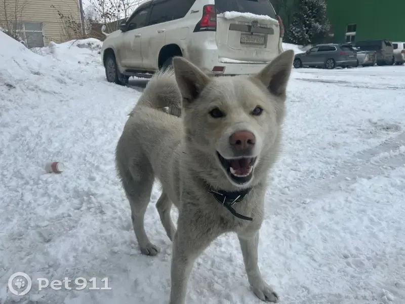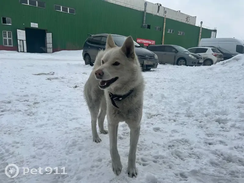 Прибилась на базу промзоны молодая собака, белая, с коричневым кожаным ошейником. Метис, похожа на лайку. По поведению домашняя, умеет выполнять команды.