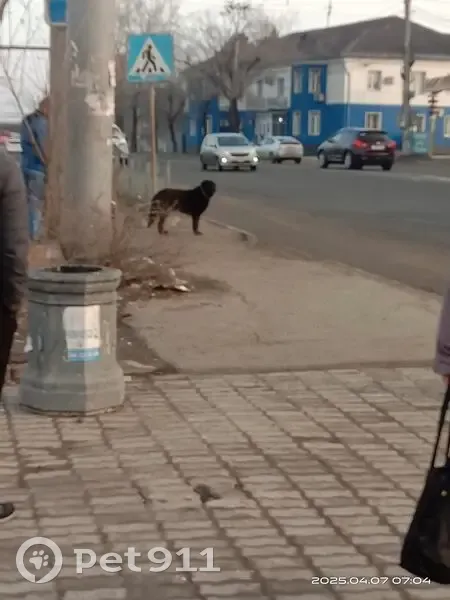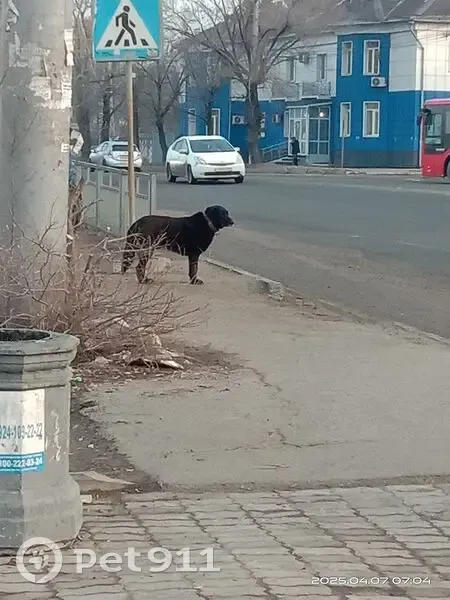 В 7.00 07 апреля 2025 года на автобусной остановке Проспект на светофоре появилась собака, переходит дорогу по светофору, не мечется, по виду домашняя в красном ошейнике, не агрессивная.