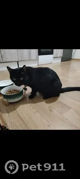 Полностью черный кот. На правом глазу пятнышко. На нем был черный шнурок с серебряным адресником. Находился на передержке и выпрыгнул в окно. В районе с 10:00 до 16:00. Кот не агрессивный, пугливый. Отзывается на Кот, котик.