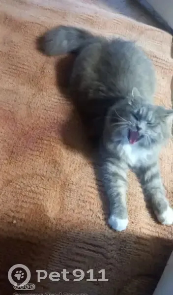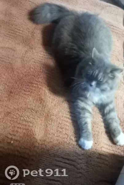 Очень пушистая, серого цвета с белой грудкой, белые носочки на трёх лапках и гольфик на задней левой, на глазках белый обвод. Предположительно угнал кот.