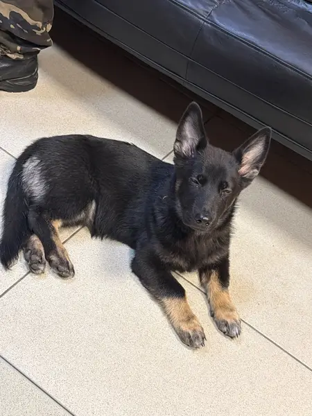 Она полностью чёрная, с белой грудкой и коричневым лапами, внешне очень напоминает овчарку. Характер трусливый, но любопытный и ласковый, игривая. Кастрирована, с чёрным ошейником. Выскочила через дверь и убежала в неизвестном направлении.