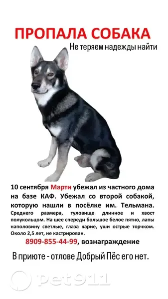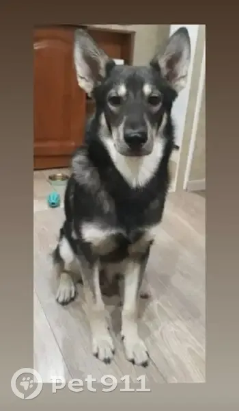 Среднего размера, черный с бежевыми подпалинами, лапы наполовину бежевые, спереди на шее большое белое пятно, уши острые светлые внутри. Не кастрирован, около 3х лет. Убежал с территории честного дома с другой собакой, которую нашли в пос Тельмана.