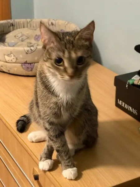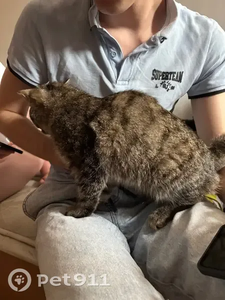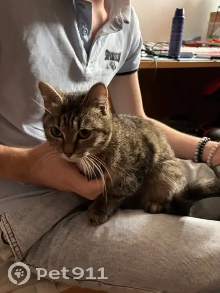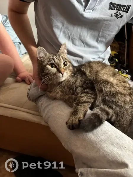 Молодая кошка, на вид месяцев 6-8. Ласковая, не боится человека, легко идет на контакт. Особенности окраса: черные подушки лапок и черное окончание хвоста. Нашлась ночью у Теннисного центра, прибежала к нам, стала ласкаться. Собирались уходить, она за нами.